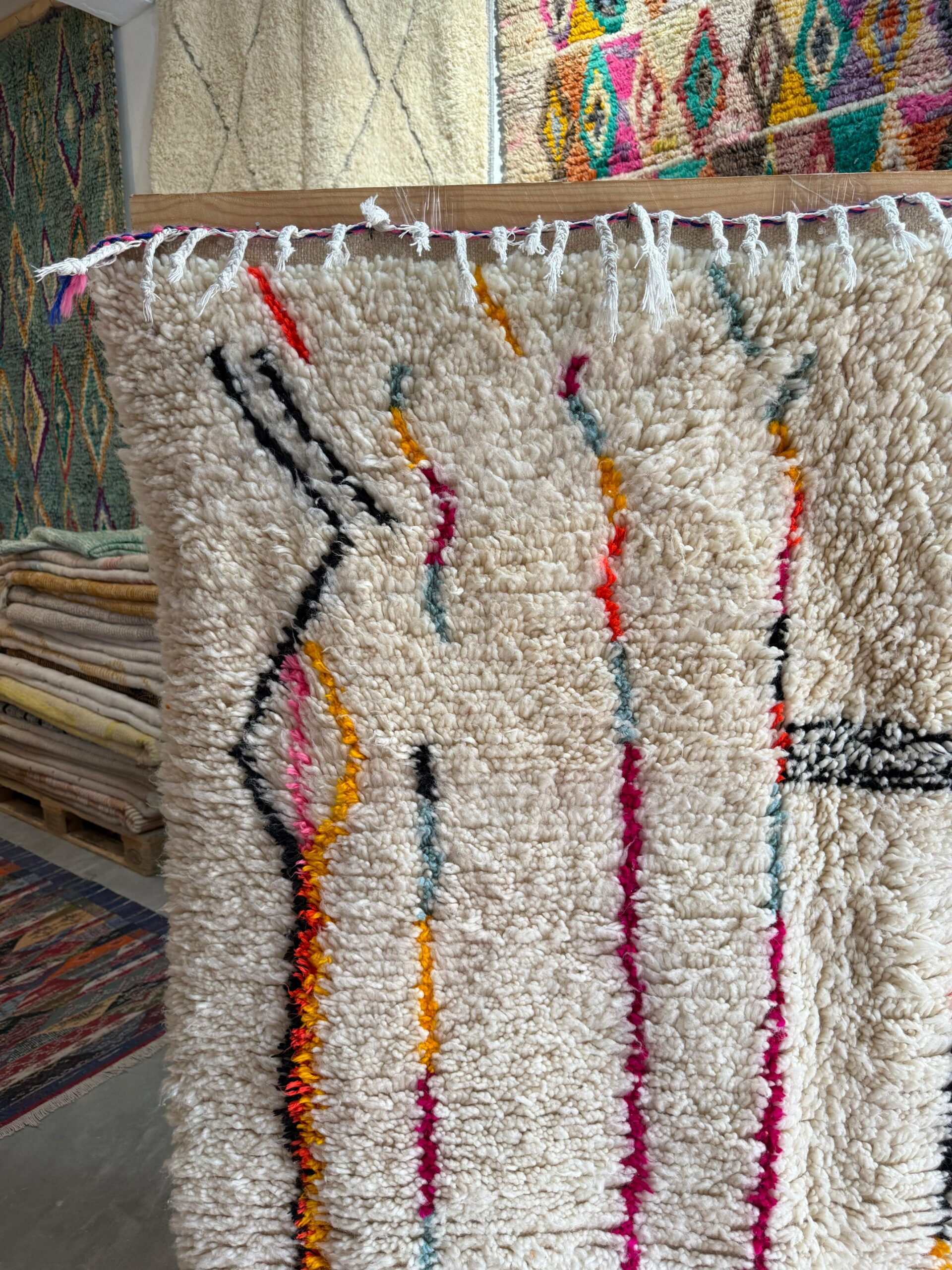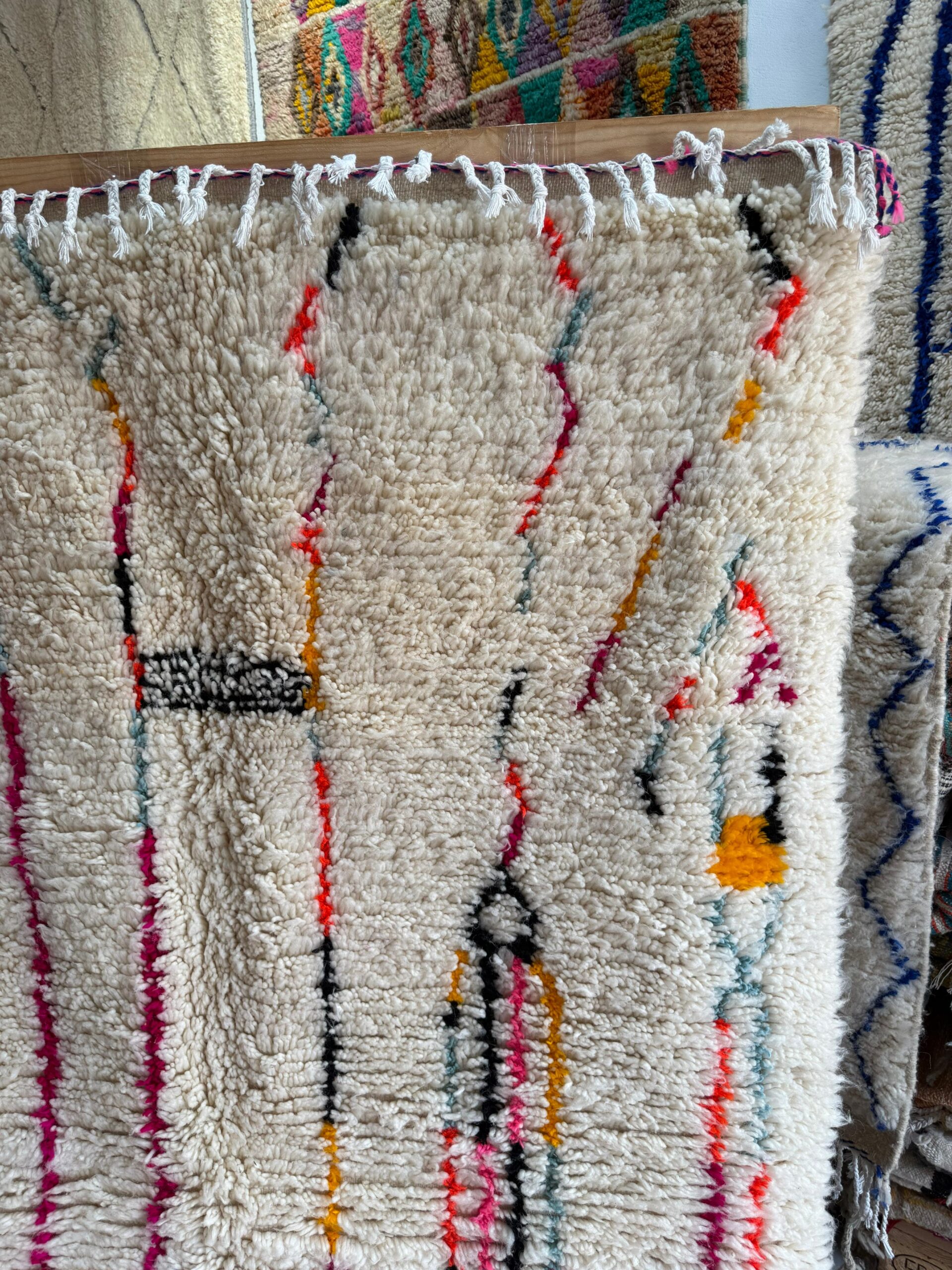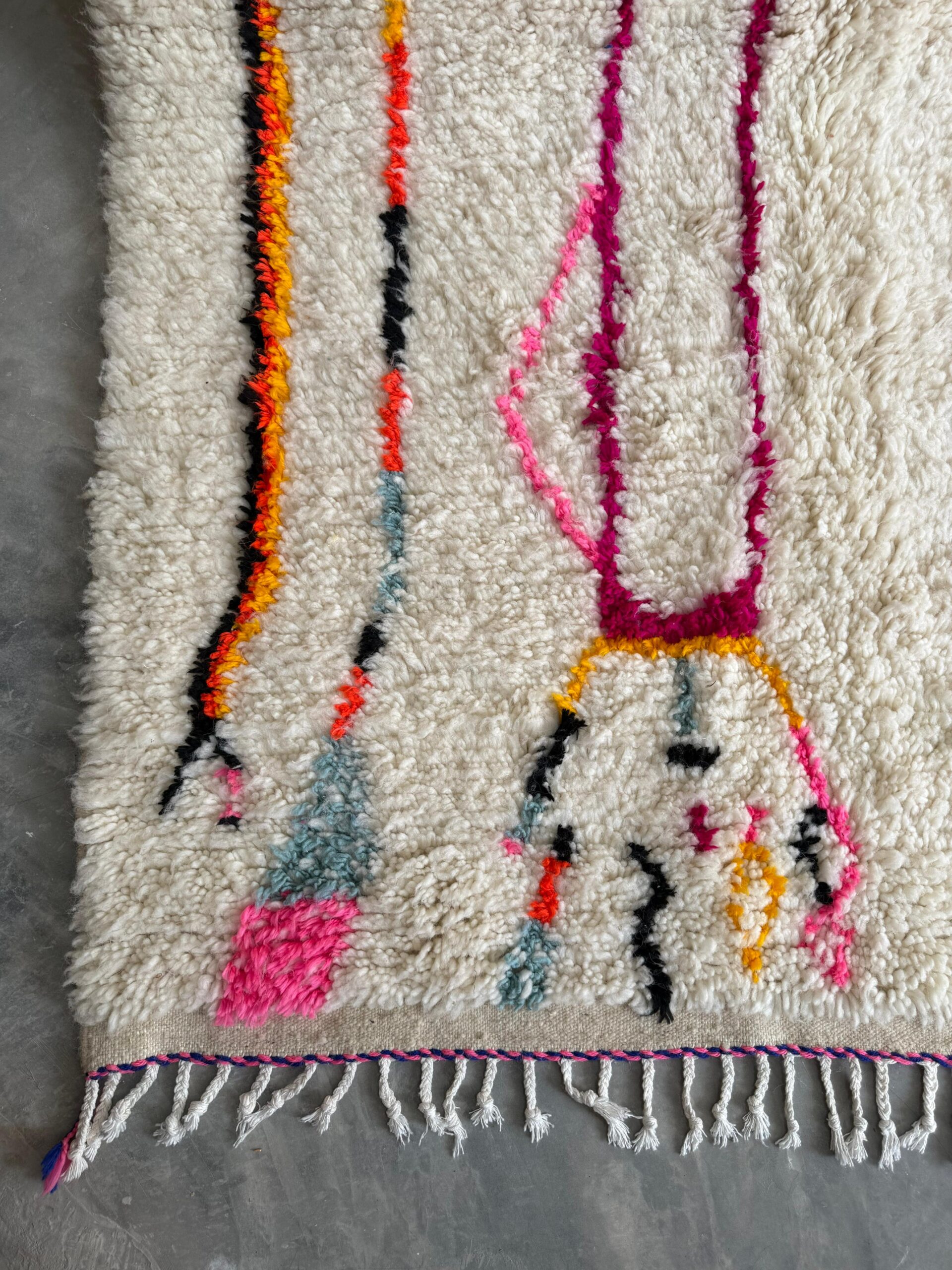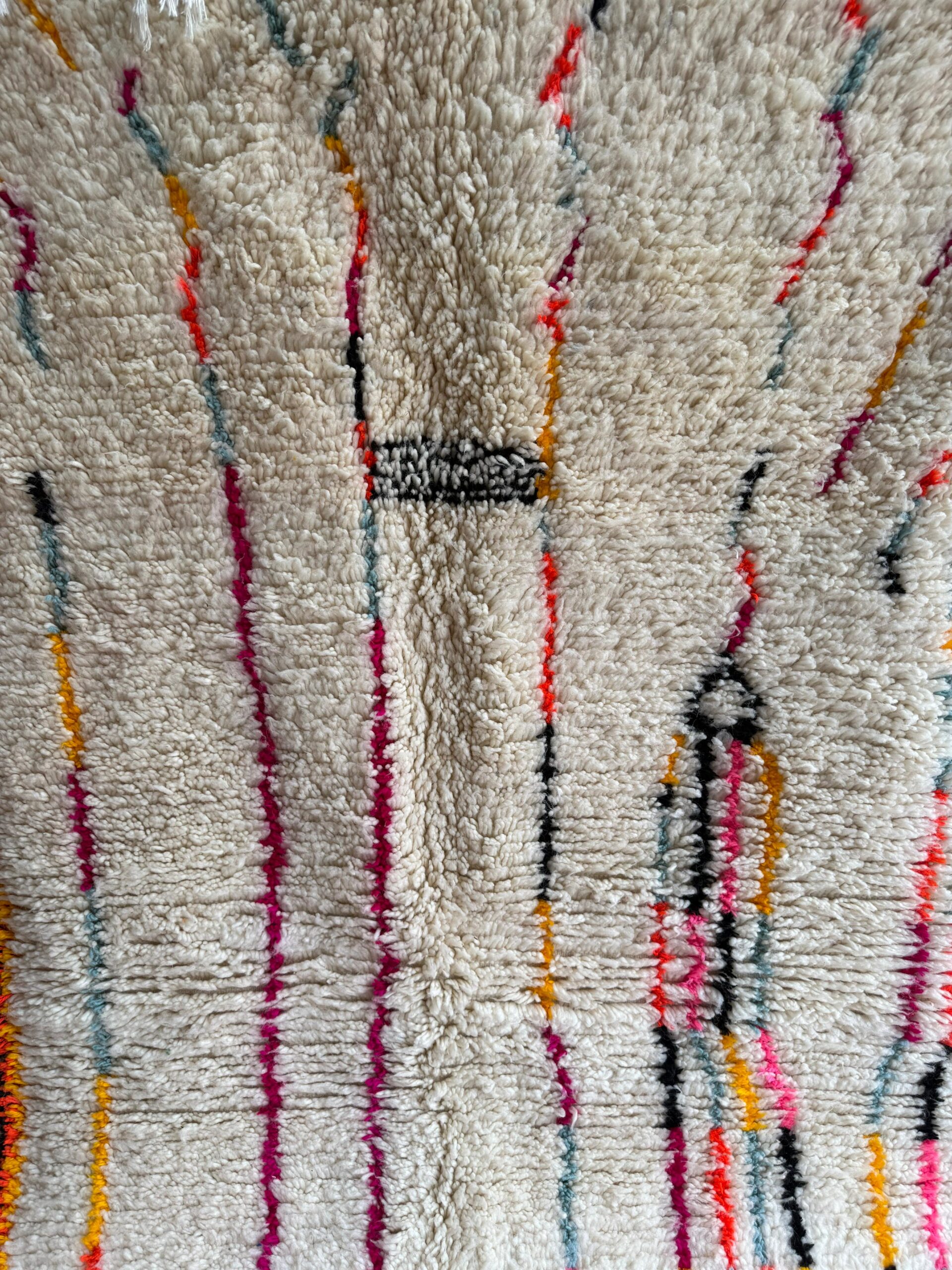 A true burst of Berber artistry, Festival of Symbols is a radiant Azilal-style rug handwoven in the Atlas Mountains. It features a whimsical tapestry of colorful diamond shapes and ancestral motifs, each one telling its own playful story on a soft, creamy wool backdrop.