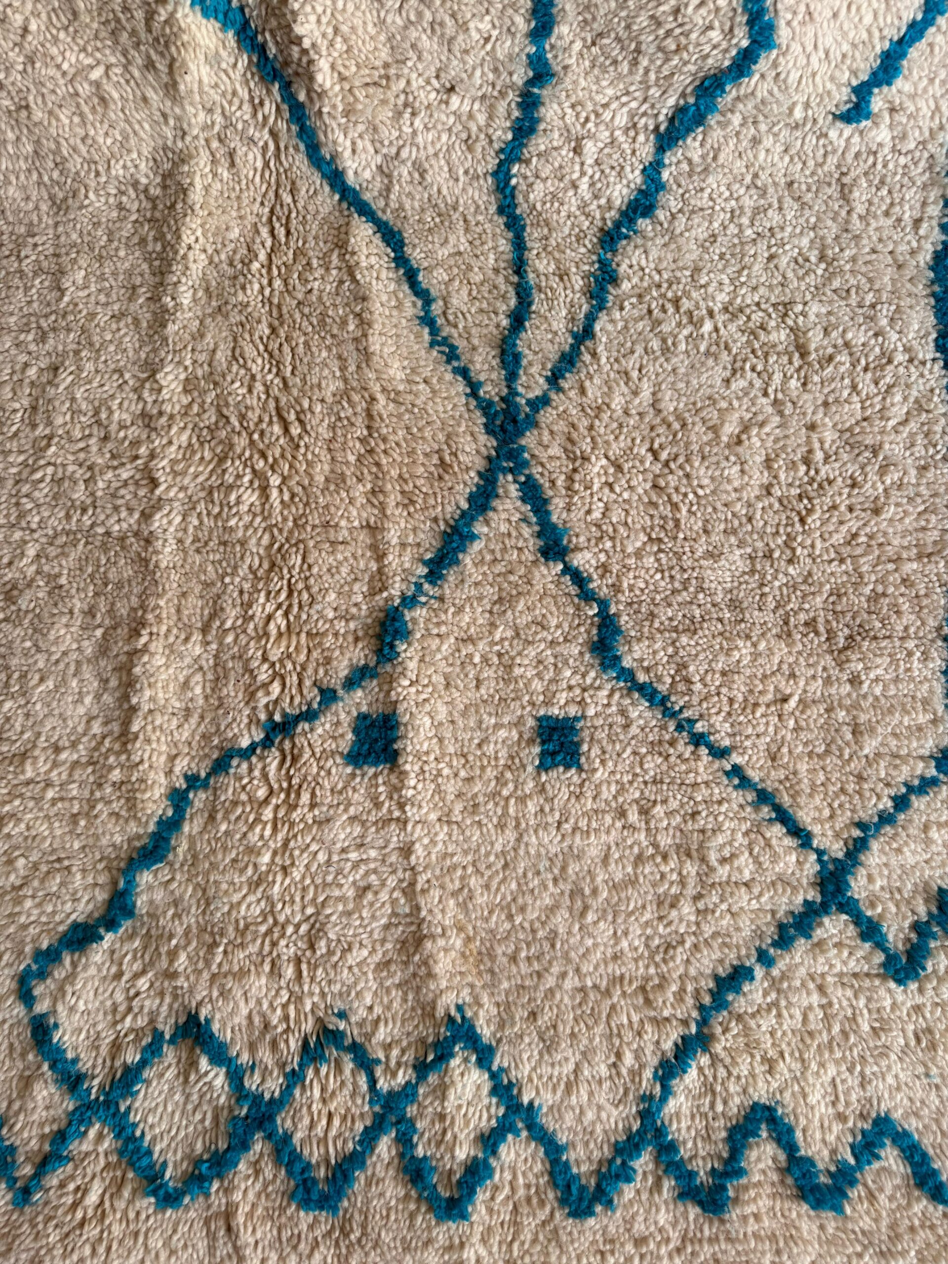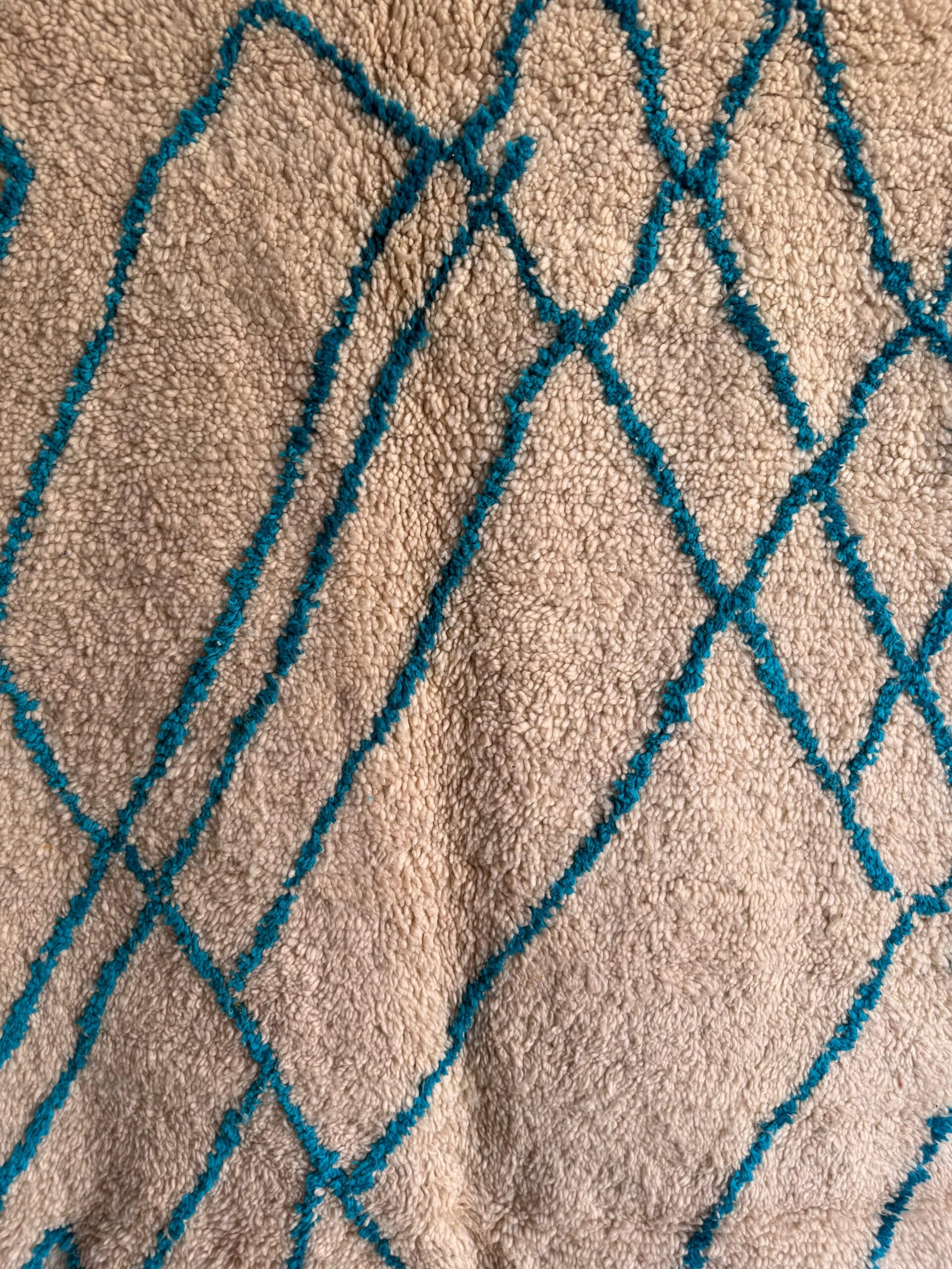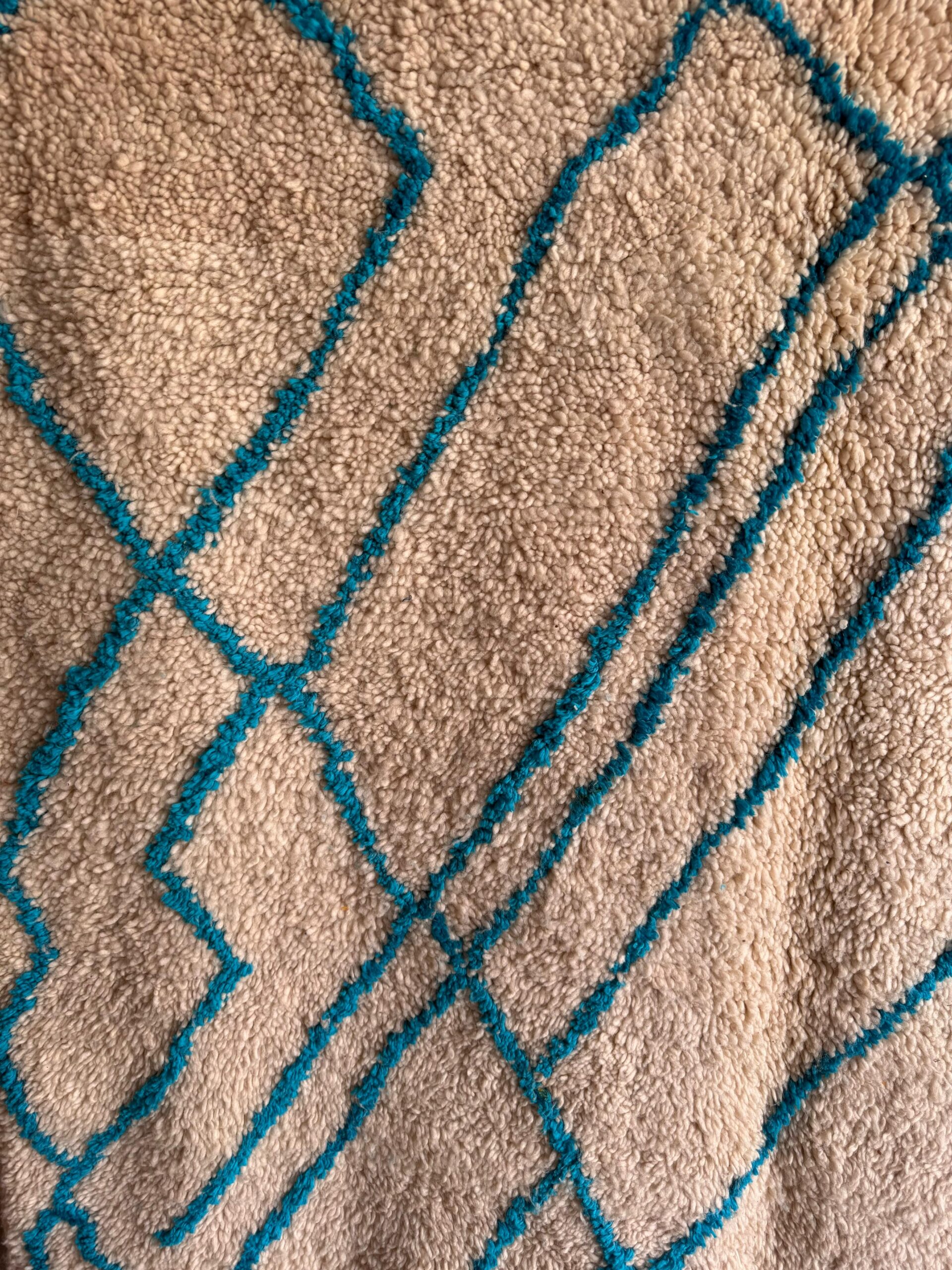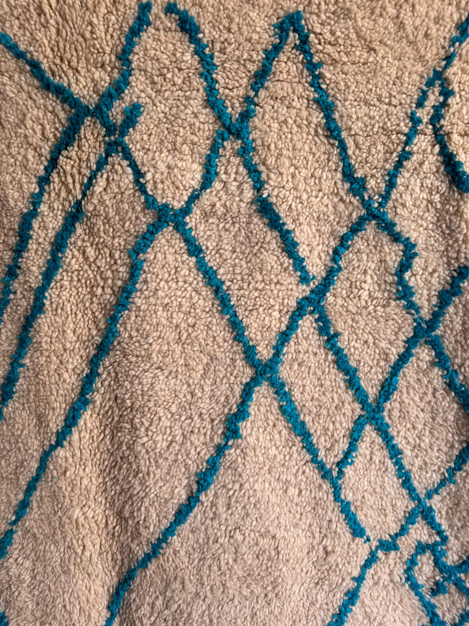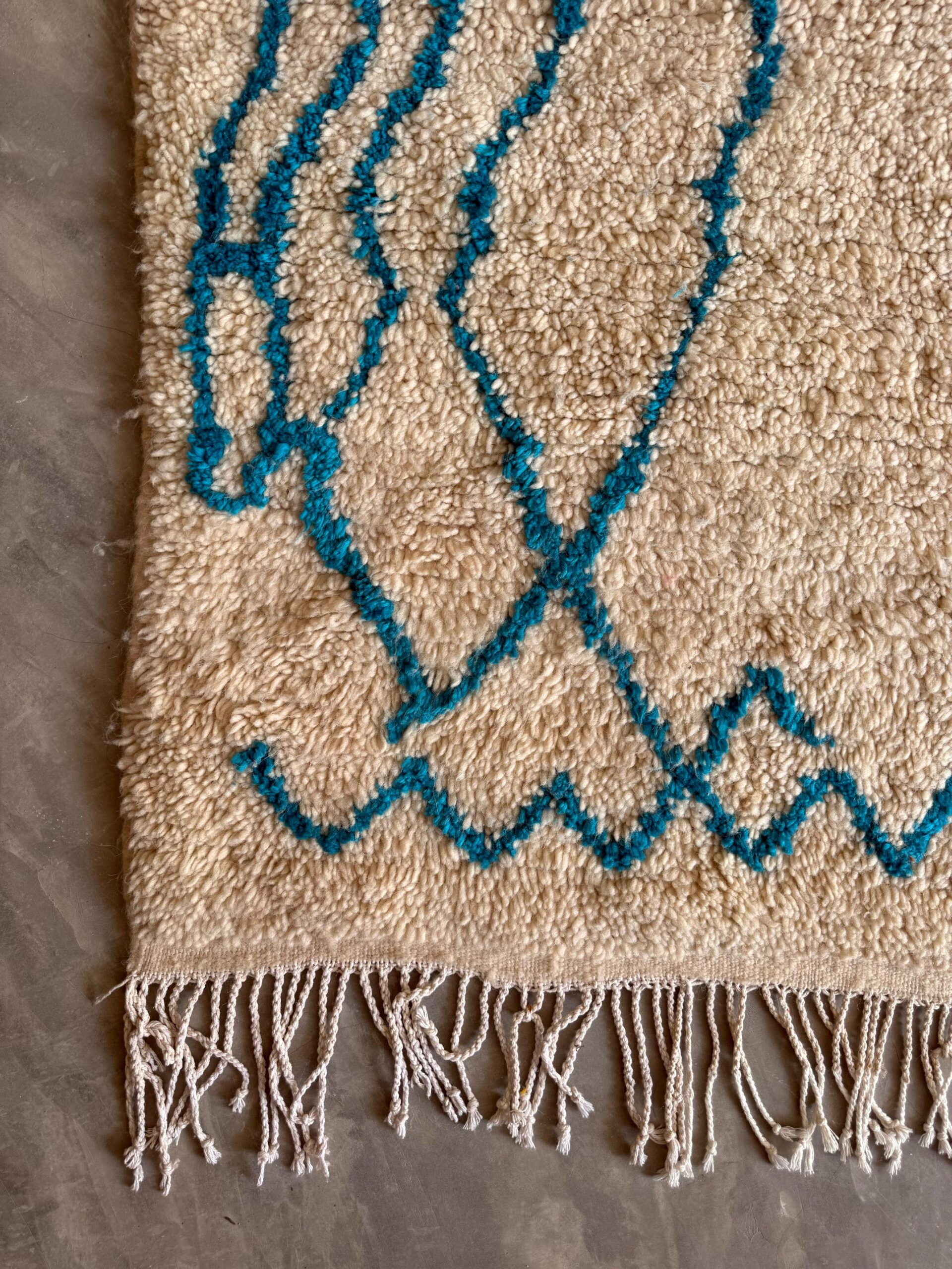 Blue Whisper embodies calm energy and modern simplicity — a stunning Azilal rug handwoven in the Atlas Mountains by Berber women artisans. Its soft cream wool serves as a serene canvas for the flowing turquoise lines that seem to dance like mountain rivers or desert winds.