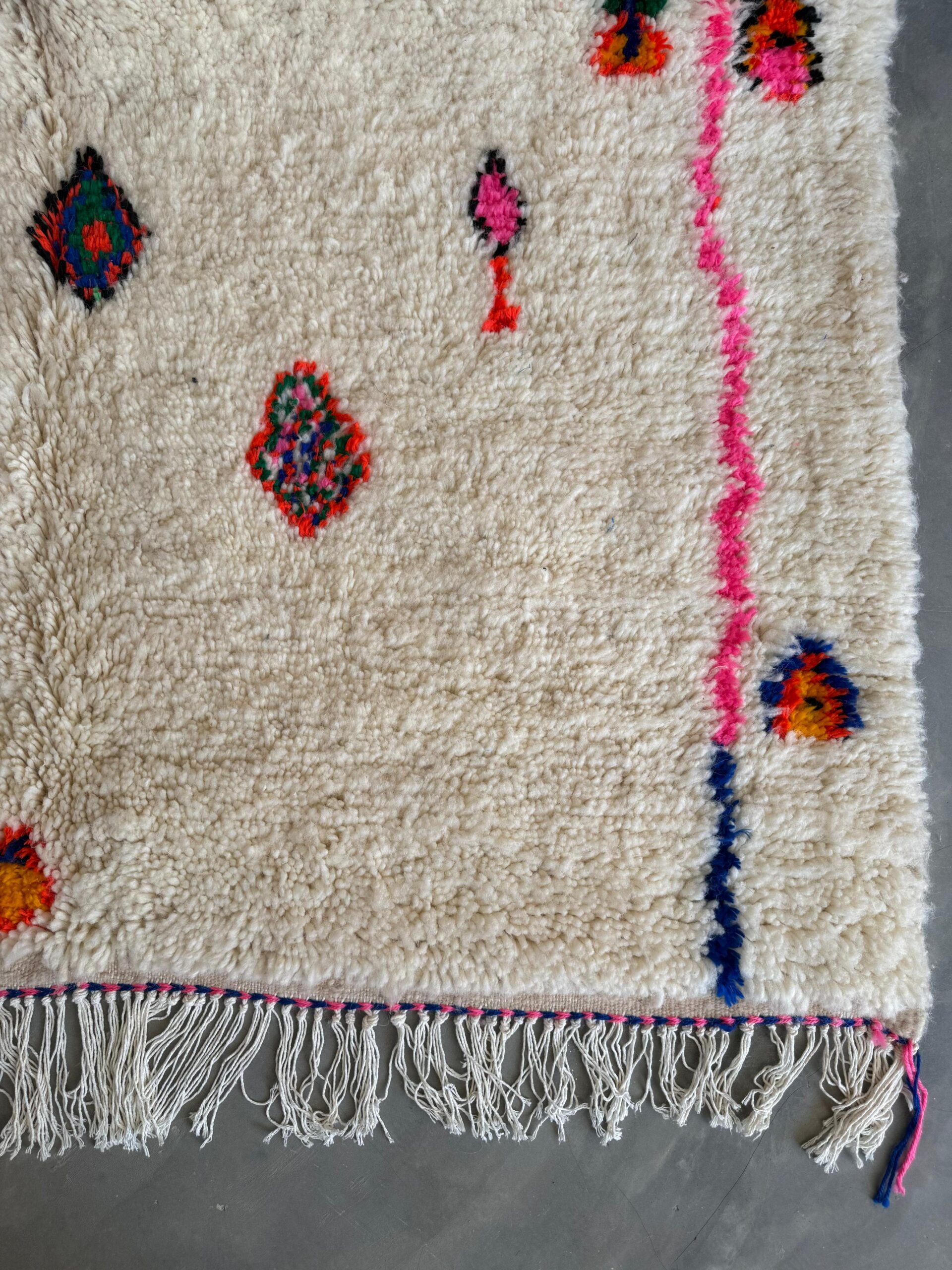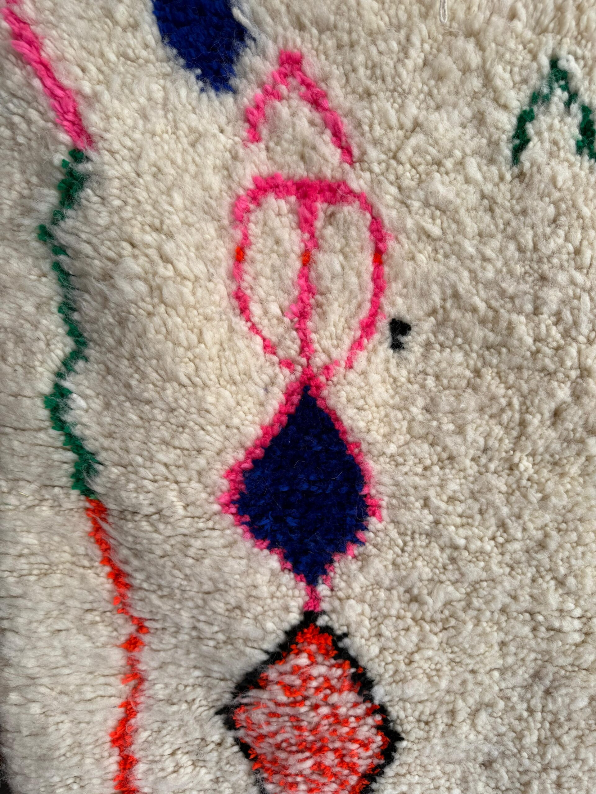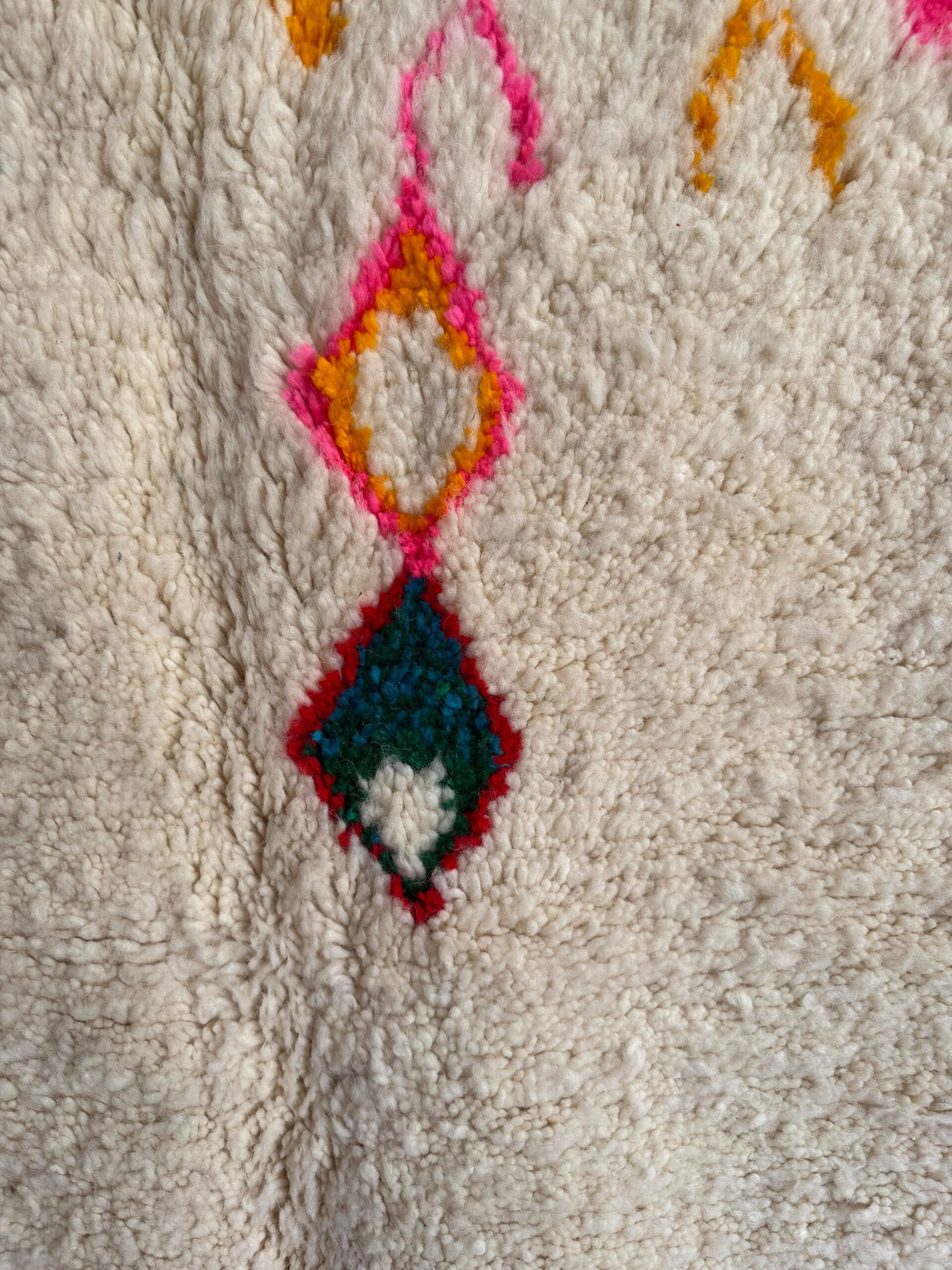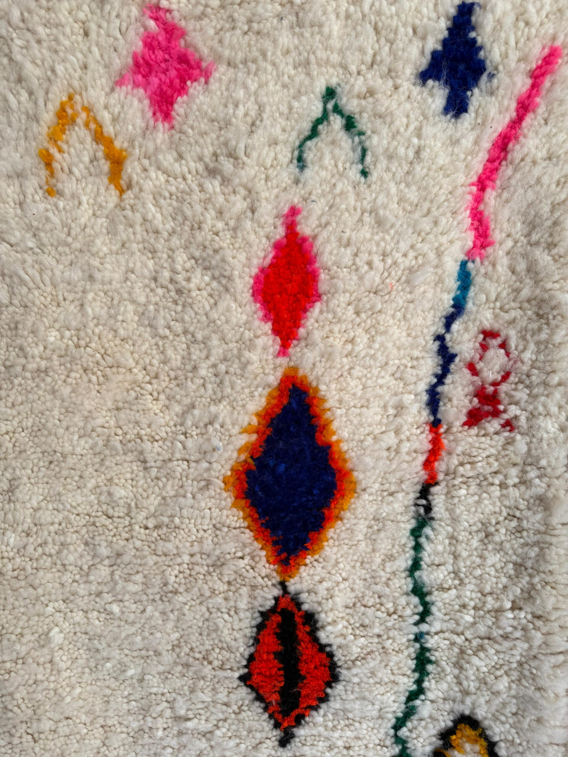 A true burst of Berber artistry, Festival of Symbols is a radiant Azilal-style rug handwoven in the Atlas Mountains. It features a whimsical tapestry of colorful diamond shapes and ancestral motifs, each one telling its own playful story on a soft, creamy wool backdrop.