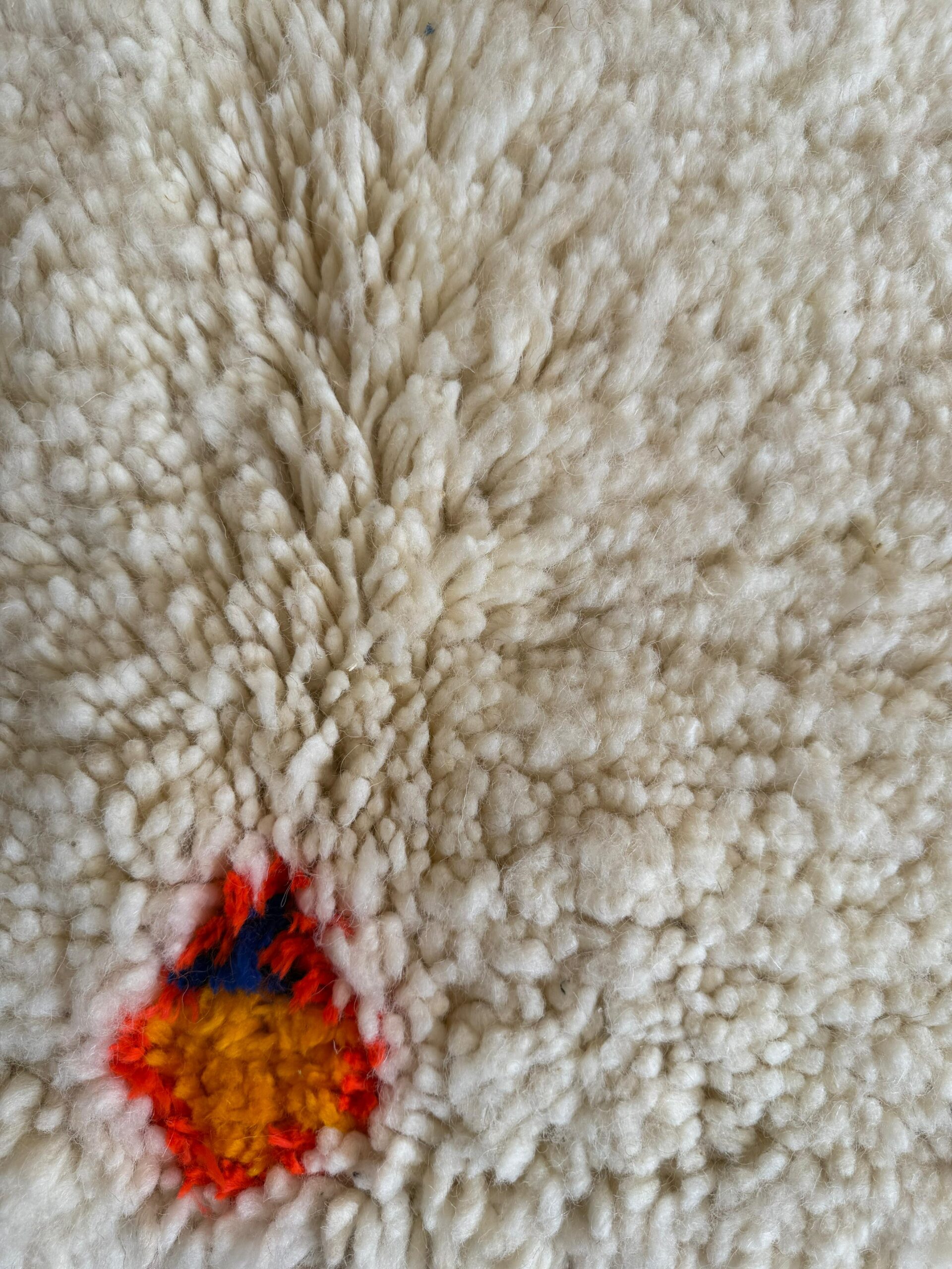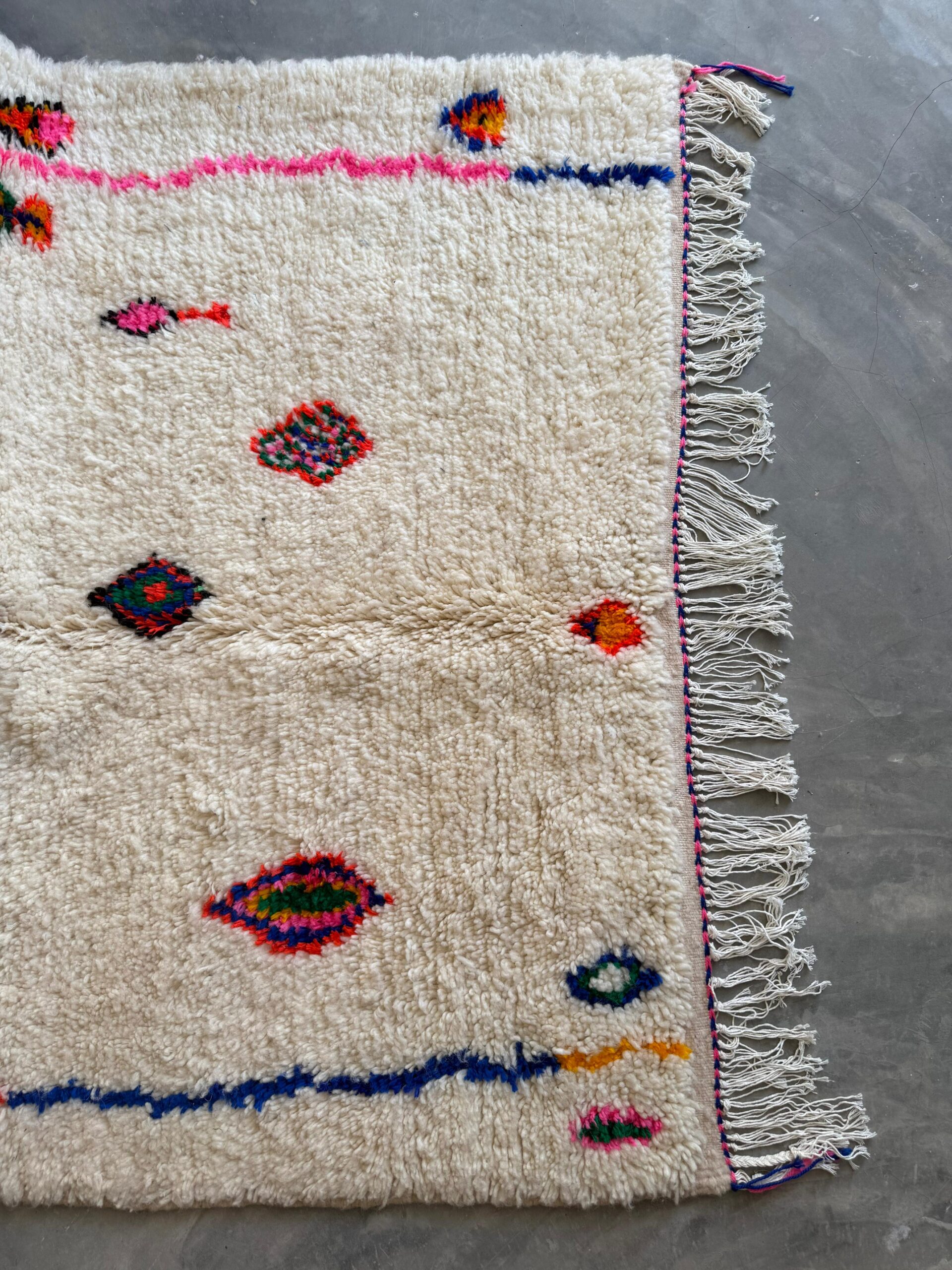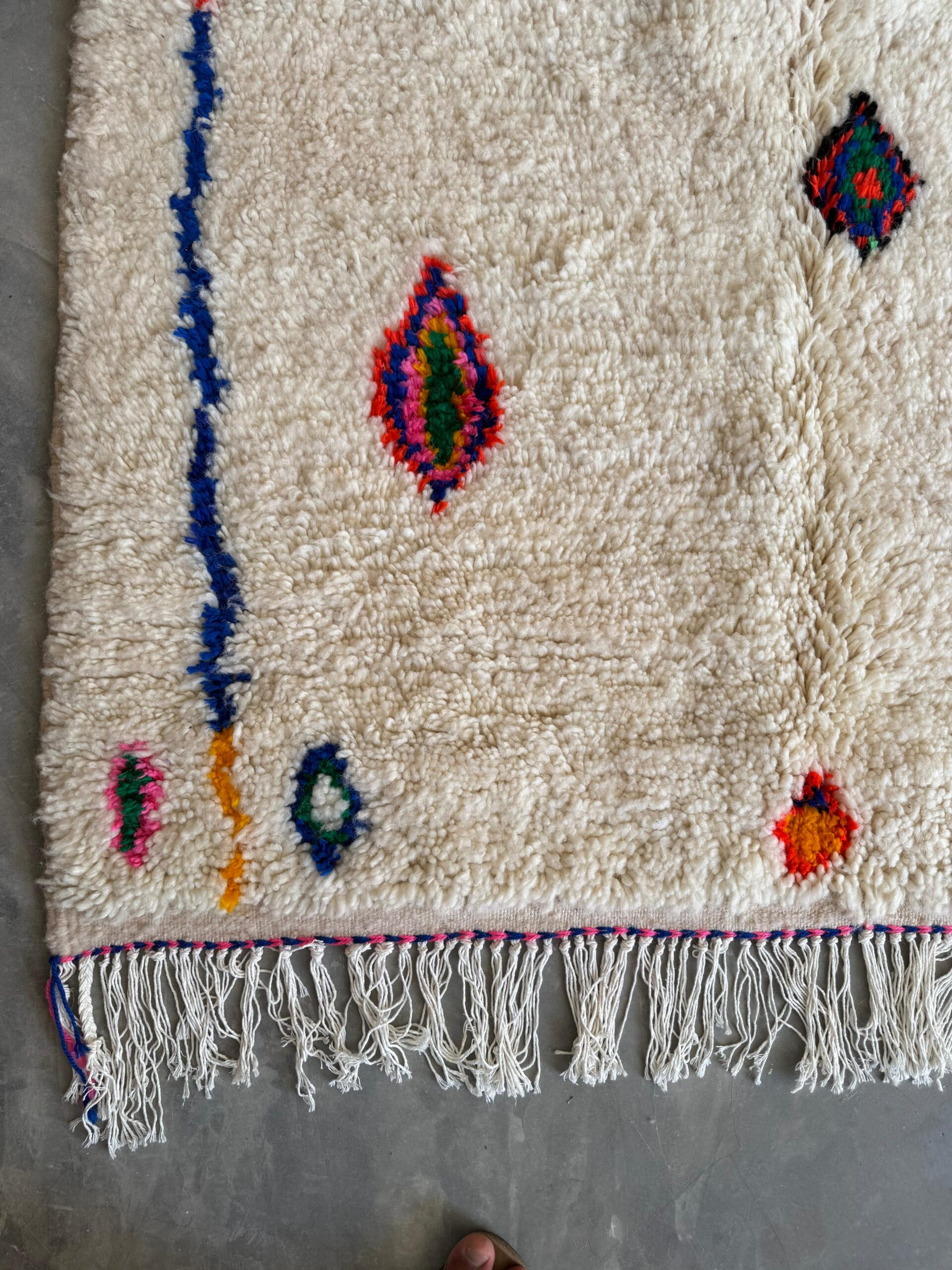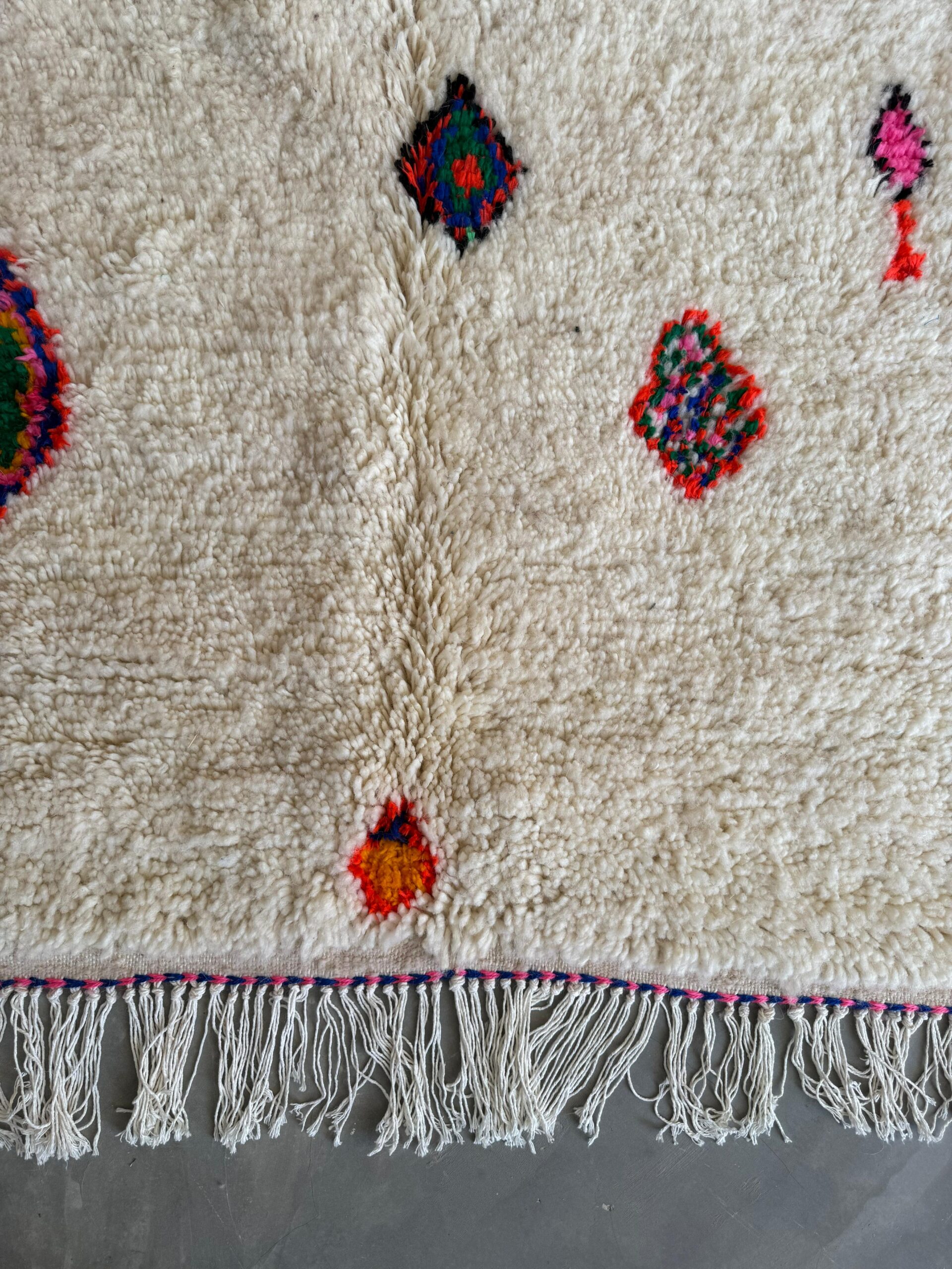 A true burst of Berber artistry, Festival of Symbols is a radiant Azilal-style rug handwoven in the Atlas Mountains. It features a whimsical tapestry of colorful diamond shapes and ancestral motifs, each one telling its own playful story on a soft, creamy wool backdrop.