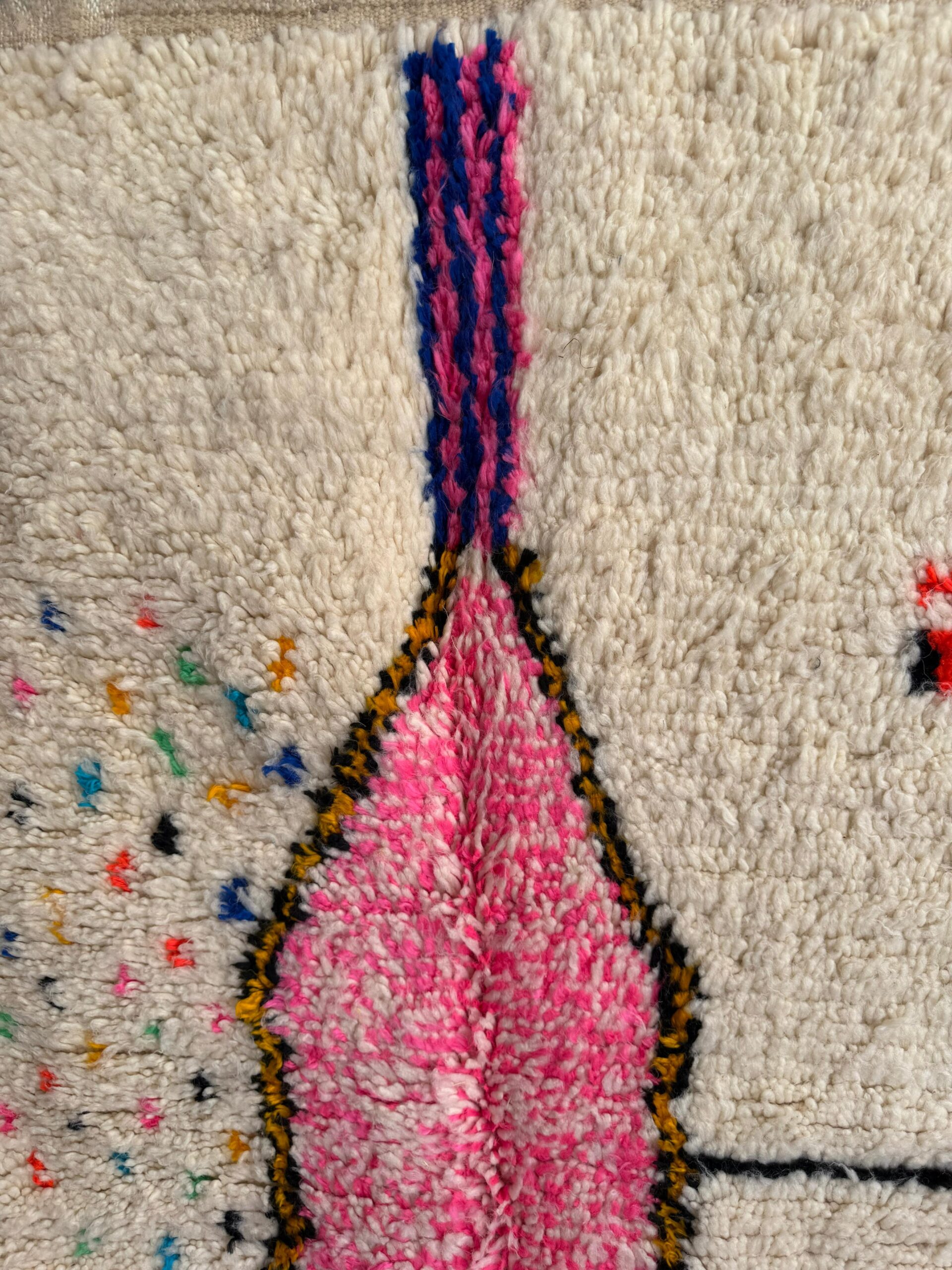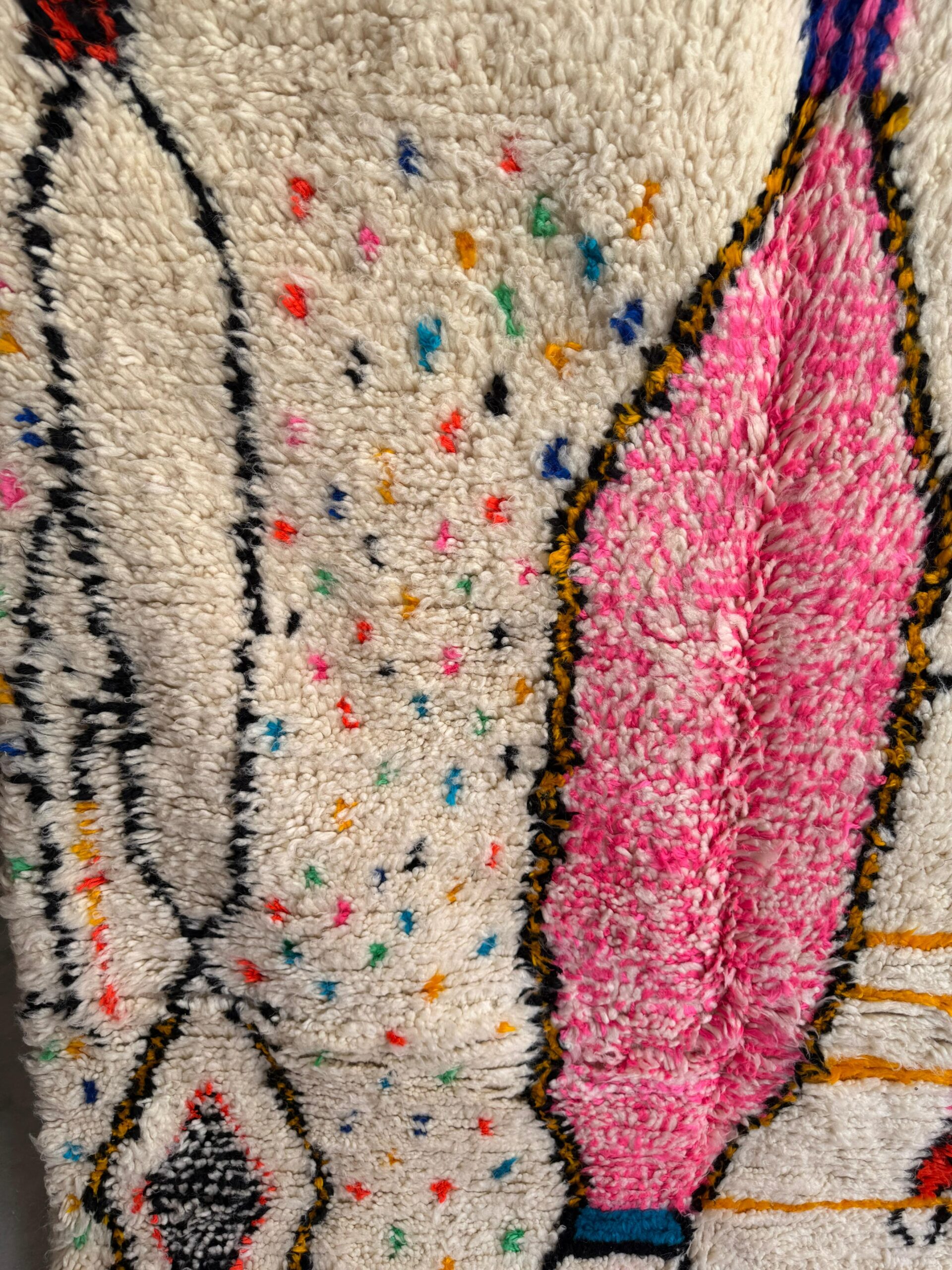 Lovingly crafted from 100% natural wool by Berber women of the Atlas Mountains, this one-of-a-kind piece features a creamy ivory base brought to life with a striking magenta form, accented by black, amber, turquoise, and coral details. Scattered dots of color evoke petals caught in motion — a joyful dance between structure and spontaneity.