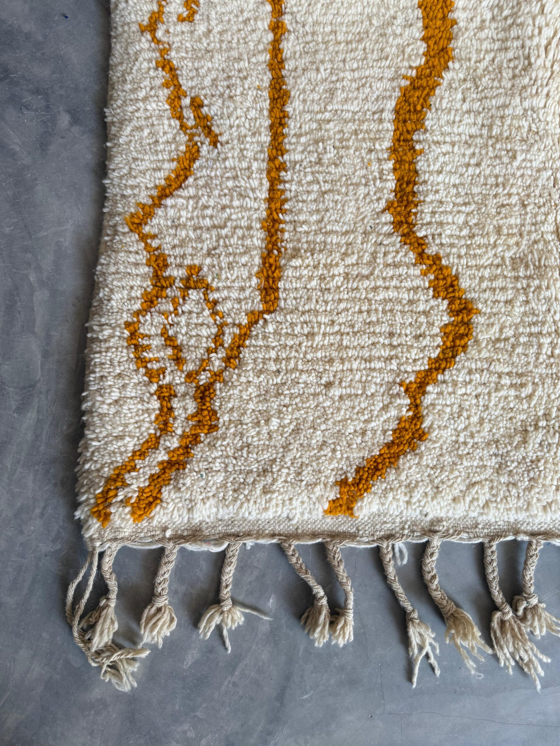 Handwoven from 100% natural wool by Berber women of the Atlas Mountains, this piece features a creamy ivory base adorned with flowing amber-orange patterns. The organic, wavy lines evoke the rhythm of desert dunes and the gentle curves of mountain paths — a dance between nature and artistry.