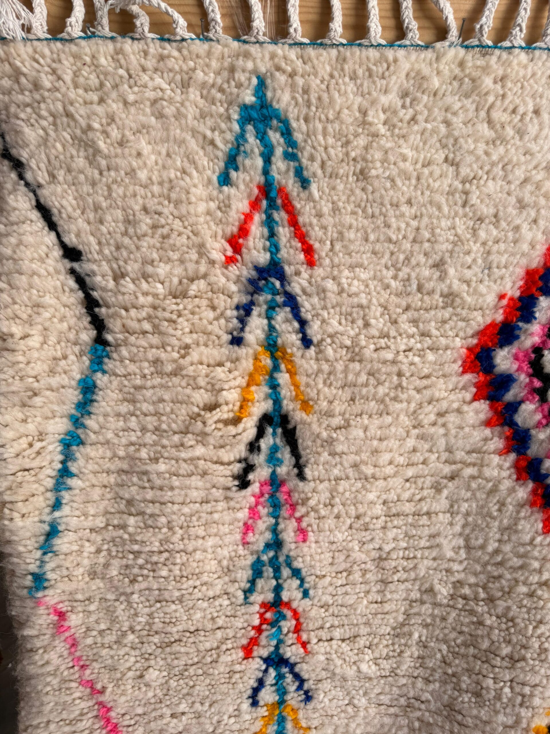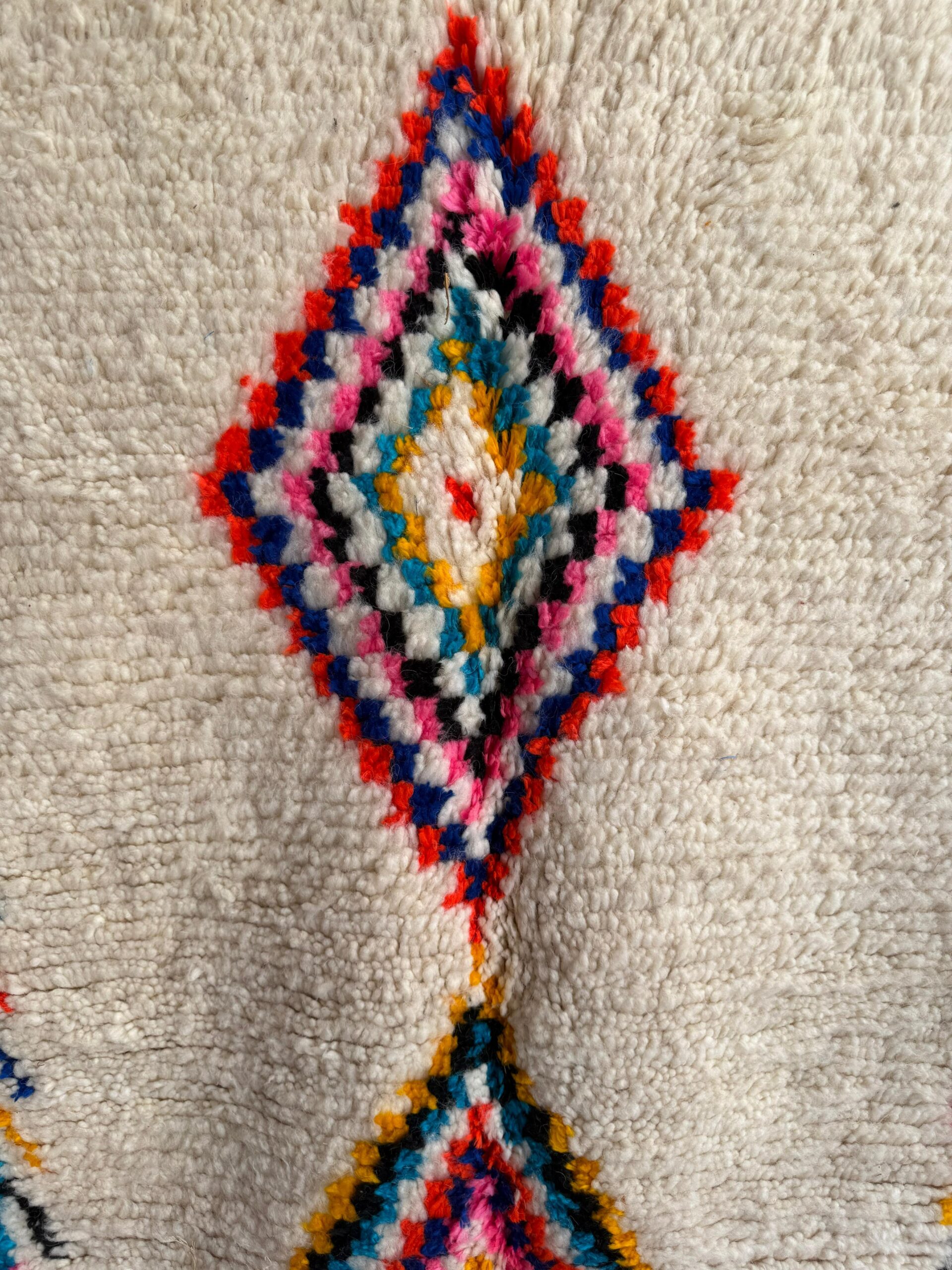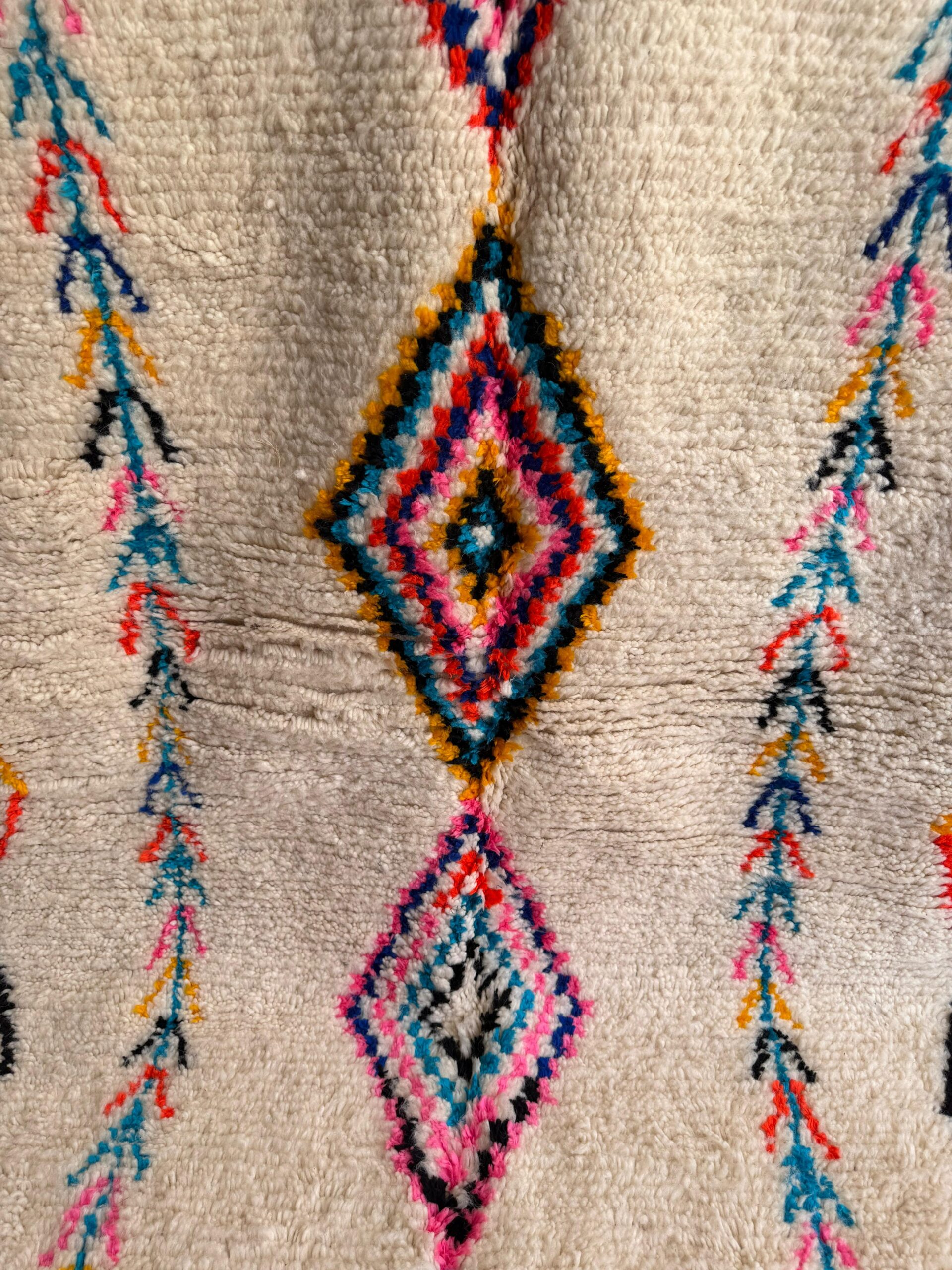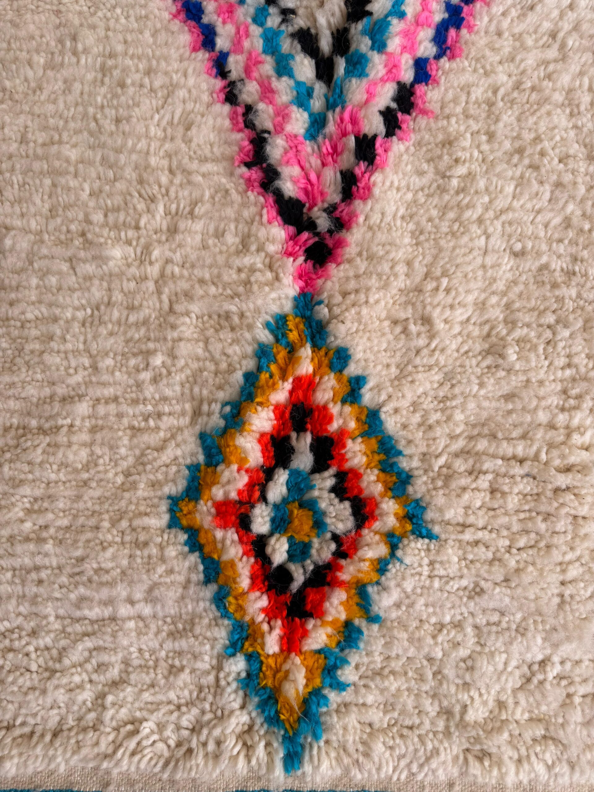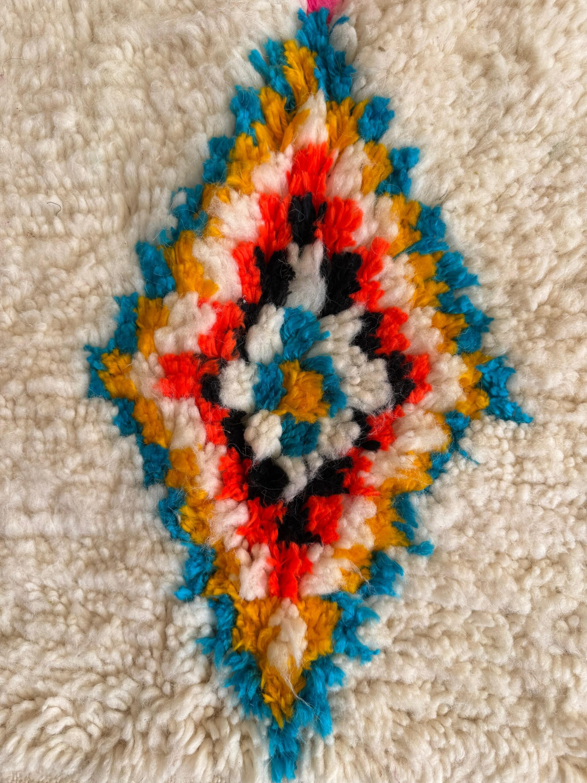 Crafted from 100% natural wool by Berber women of the Atlas Mountains, this rug features a creamy ivory base adorned with bold diamond motifs and arrow-like lines in vivid tones of turquoise, coral, fuchsia, amber, and midnight blue. Each symbol traces a path of energy and hope — a story of forward motion, woven from memory and spirit.